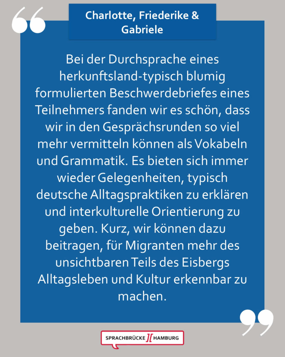 Als ich [aus Italien] nach Deutschland gekommen bin, fiel es auch mir schwer, Deutsch zu sprechen. Sprachlosigkeit kann in Ohnmacht münden. Aber ich habe entdeckt, dass die Hamburger offen und hilfsbereit sind: dadurch ist aus Zurückhaltung Dankbarkeit und Freude am Lernen geworden. Durch Vertrauen schließt man Freundschaften, die Sprache wird das Mittel, um sich gegenseitig kennenzulernen. Was ich am meisten an der Sprachbrücke-Hamburg schätze, ist die herzliche, einladende Stimmung: Fehler sind willkommen, verschiedene Perspektiven und Lebensentwürfe sind willkommen – jeder ist willkommen, zugehört und geschätzt. Es ist ein Ort der Begegnung.