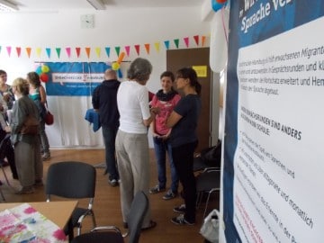Zur Begrüßung stellte Vereinsvorsitzende Annja Haeling von Lanzenauer die Ehrenamtlichen einander vor und fasste kurzweilig die Entwicklung des Vereins zusammen: Seit Jahresbeginn hat sich die Zahl der Ehrenamtlichen verdoppelt, die Anzahl der Gesprächsrunden ist sogar von zehn auf nunmehr über 25 gestiegen. Ein guter Grund, um nach zwei Jahren Vereinsaktivität zum ersten Mal ein Sommerfest zu feiern, um den rund 70 ehrenamtlichen Mitarbeitern für ihr Engagement zu danken.