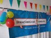 Bunte Luftballons wiesen den Ehrenamtlichen den Weg zum Sommerfest der Sprachbrücke Hamburg: Das Büro-Team des Vereins hatte einen Seminarraum des Kulturschlosses mit Girlanden, Luftschlangen und dem Logo des Vereins farbenfroh dekoriert. Bei schönstem Spätsommerwetter folgten viele Ehrenamtliche der Einladung – beladen mit Kuchen und Törtchen für das süße Buffet.