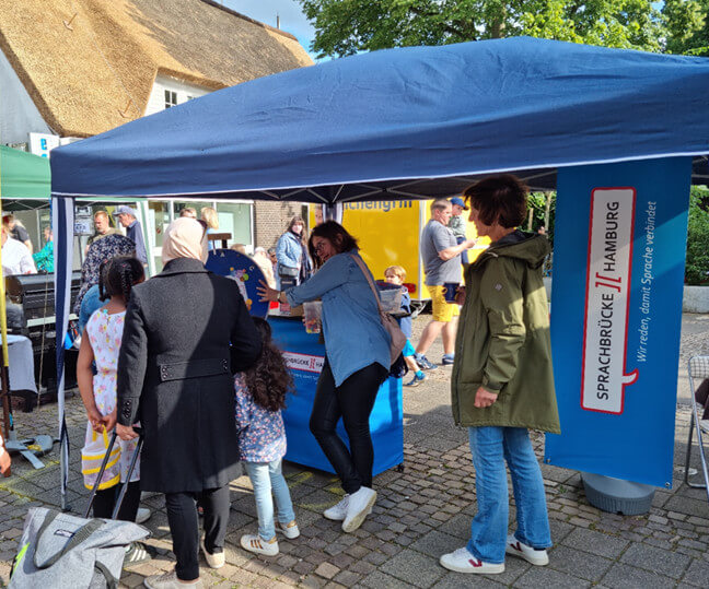 Seit Ende April 2023 sind wir mit einer Präsenz-Gesprächsrunde bei ASB Suurheid in Rissen. Da kam das Fest „Rissen für Alle!“ wie gerufen, um schon einmal vorab Werbung zu machen.