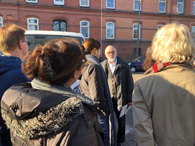 Das Wetter war wie bestellt für diesen Stadtspaziergang, der vom Team Büro für den 27. Februar 2019 organisiert worden war: Bei strahlendem Sonnenschein und einem mildem Lüftchen wandelten rund 25 Teilnehmer*innen und Gesprächsleiter*innen unserer Gesprächsrunden auf den Spuren jüdischen Lebens in Hamburg.