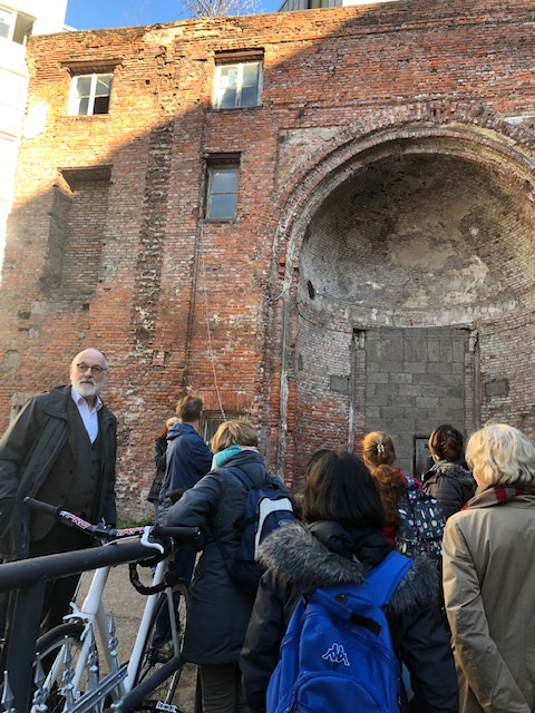 Dr. Ulrich Lohse, selbst langjähriger Gesprächsleiter und ehrenamtlich Engagierter im Team Büro, führte die Sprachbrücke-Hamburg e.V.-Gruppe vom früheren „Judentor“ am Millerntor über das ehemalige Wohnquartier in der Neustadt bis zum Geschäftszentrum am Jungfernstieg. Viele Teilnehmer*innen kamen insbesondere beim Anblick des ehemaligen Tempels in der Poolstraße nicht mehr aus dem Staunen heraus. Er liegt verborgen in einem Neustädter Hinterhof und ist seit einem Bombentreffer 1944 nur noch rudimentär erhalten. Auf der Fläche des einstigen Gotteshauses schrauben heutzutage die Mitarbeiter einer Kfz-Werkstatt. Vom vergangenen Leben jüdischer Mitbürger künden hier wie auch an vielen anderen Stellen in der Innenstadt nur noch wenige Überbleibsel. An einigen Orten fehlen sie gänzlich und so füllt nur das Wissen um die Geschichte diese Lücke.